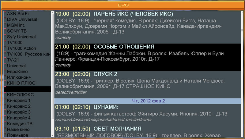 boss911 wrote:3. Открываем "Список каналов 2" и включаем какой-то канал. Открываем "Список каналов 1". Открываем GUI EPG, появляется первый канал этого списка, а не тот, который идет в данный момент. Хотелось бы, чтобы в этом случае открывался сразу текущий канал.