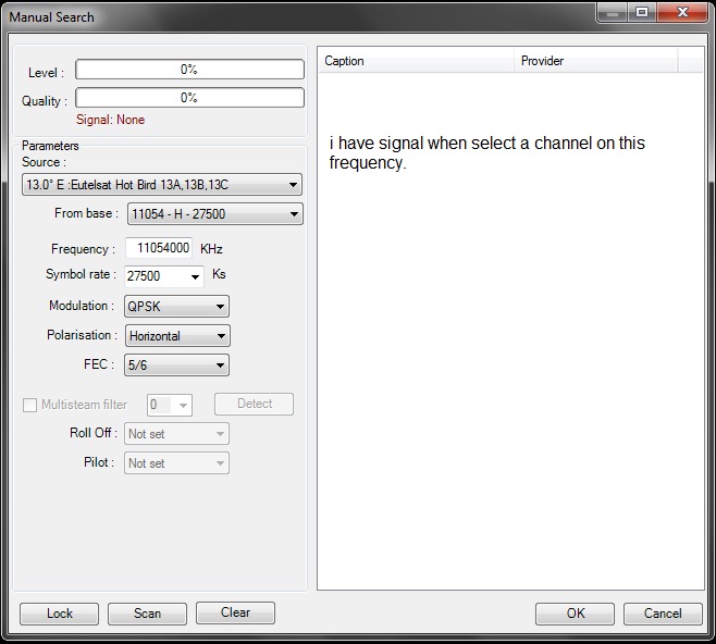 problem with progdvb 6.91.2 in Manual Search , when i go to Manual Search it take a lot of time to open this window (not responding...) and after it open there is no signal (signal : none) , when i click Lock , it lock on the tp and become green but after 1second again automatically saying signal : none. but i have good signal on all frequency's and i can watch channels with progdvb before was scanned , same with full satellite search ...