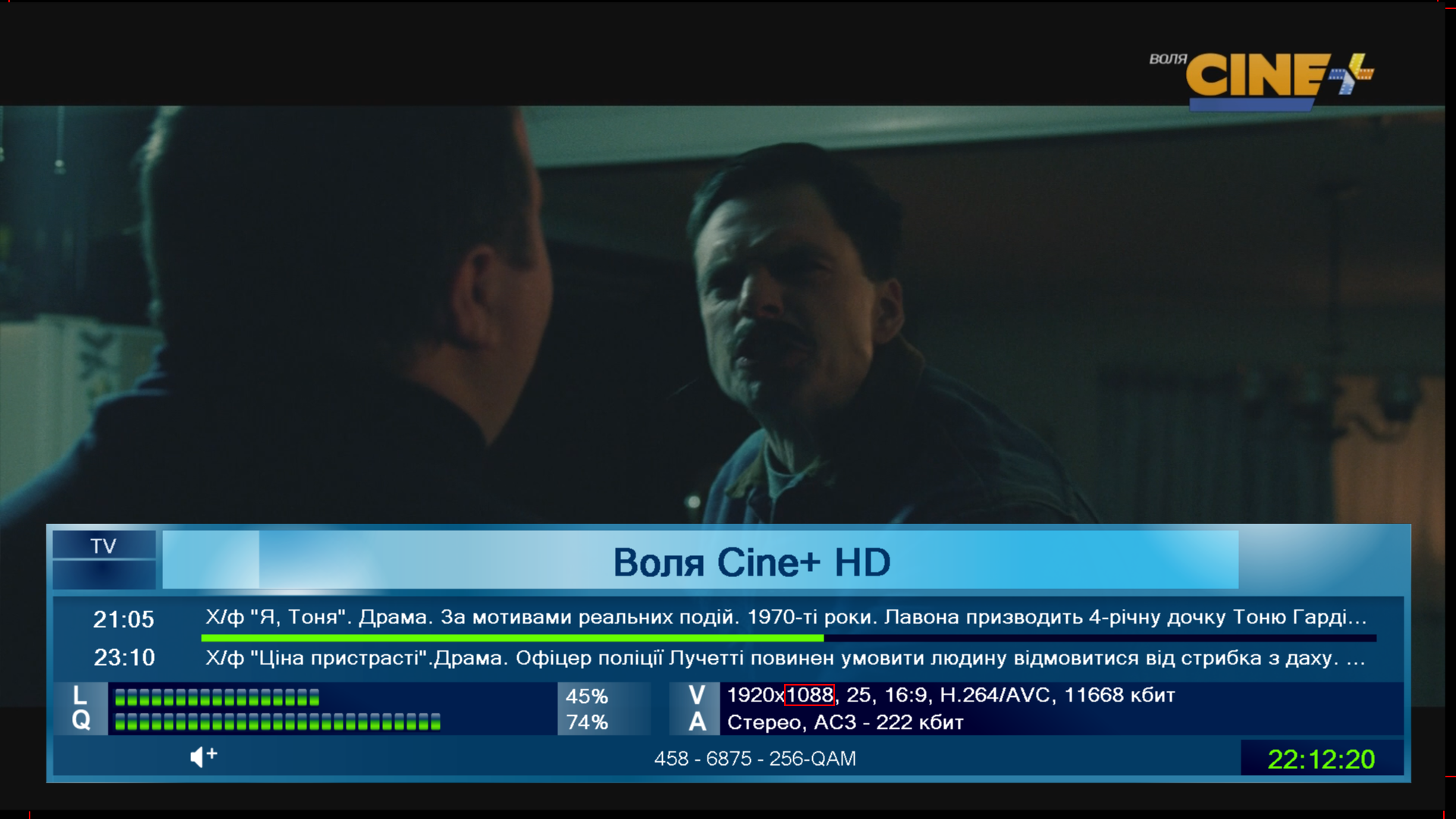 Также видно, что количество строк кадра определяется неправильно (1088, вместо 1080). Может быть, какое-то влияние может иметь то, что у меня экран 1920х1200 (т.е. соотношение сторон у него 16x10). Но, повторюсь, эта проблема есть в любом режиме просмотра (Видео окно, нормальный экран, полный экран) HD-каналов с EVR Custom.