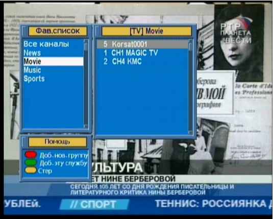 На скриншоте вообще кривой недоперевод. У меня был topfield tf3000fi, там был нормальный полный русский перевод и надпись "любимые каналы". Но суть не в этом. Мне такой перевод кажется наиболее удачным. В progdvb слово favorite относится только к каналам. Если бы там были всевозможные онлайн сервисы, ссылки, приложения и т.п., то можно было бы назвать такой список как "избранное" .Однако "избранный канал" сказать не поворачивается язык.