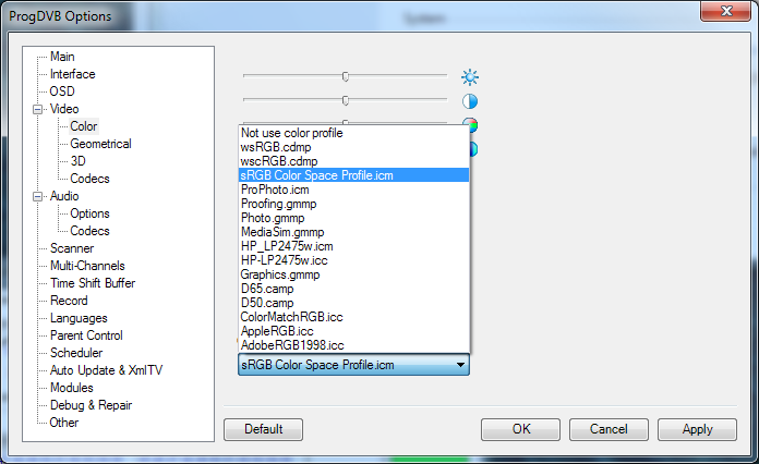 2. В ProgDVB Video Renderer: EVR Custom или WMR-9 Renderless, в Color profile: Ставлю свой профиль (или любой другой), картинка не меняется.