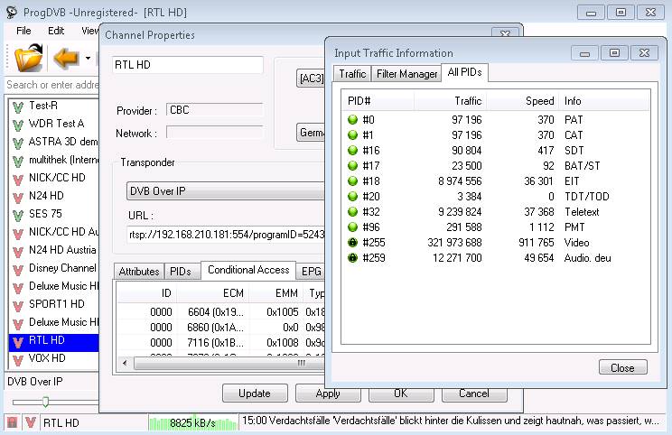 Related to support Plugins: For sure you can do that. This device is a REAL DVB device. You receive the FULL TS (filtered without non related pids). The device don't "repacks" anything, it only filters pids... no more, no less! At time, you're not using pid commands (as the full SAT>IP protocol specifies), but the result is the same: you receive all TS packets filtered with all pids of the channel. No differencies at all. So, you don't have any fundamentation to not support this. Moreover, this is the reason to use ProgDVB and not other software for view channels with a SAT>IP server. Your software will be the first (and at time the only one) on Windows platform to support plugins with a SAT>IP server.