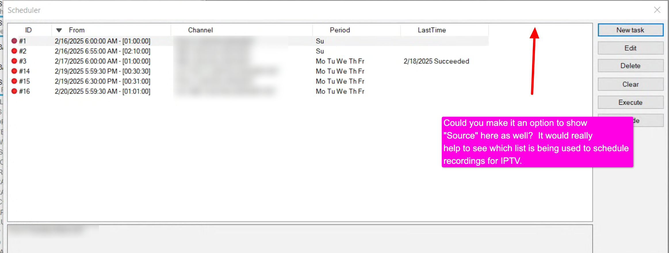 I am looking for a way to identify which stream is playing when a program is live in the viewing window, or to see which service is being used for a background record job, or to see which playlist is being used for a scheduled recording job. Is any of this possible?