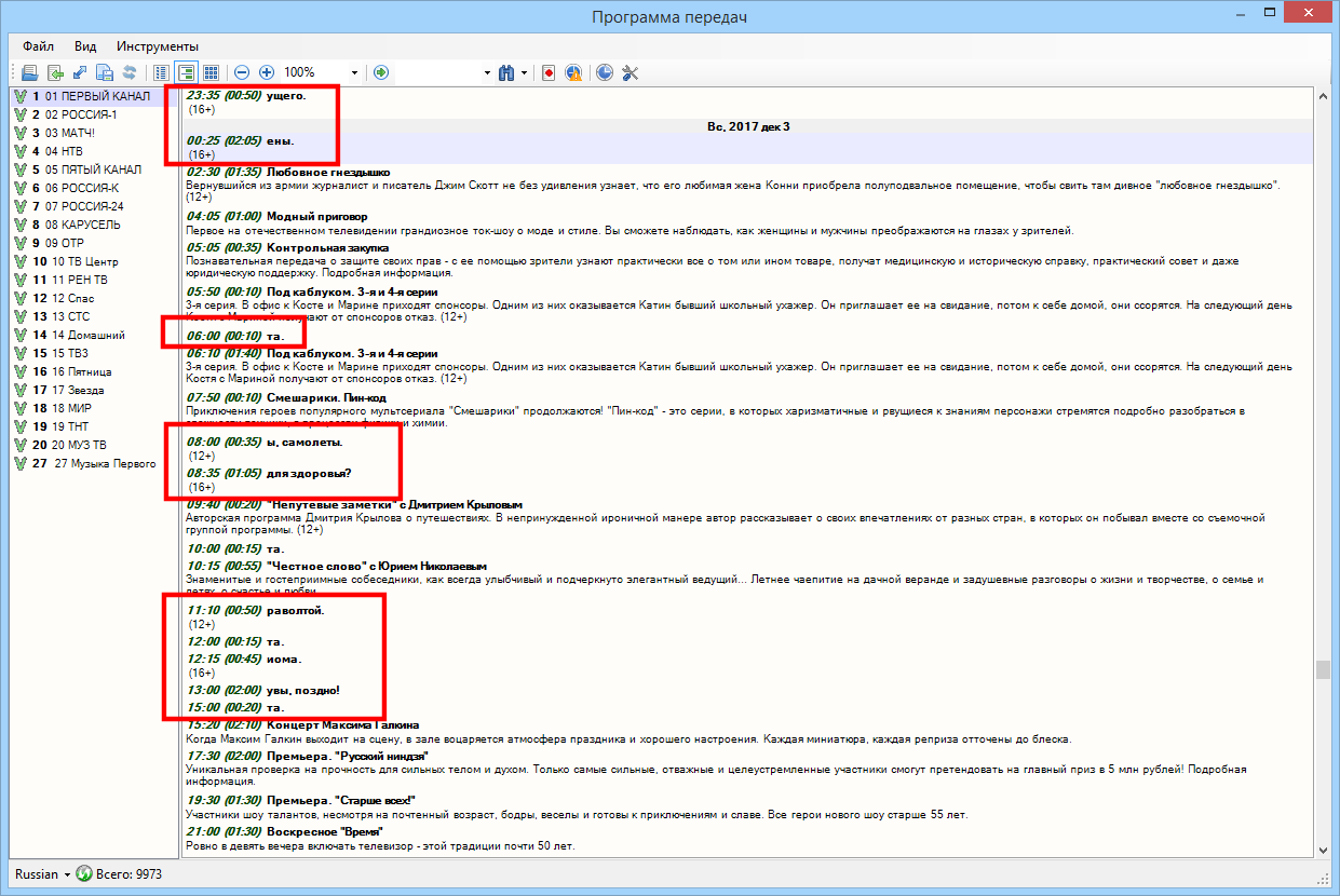 На некоторых программах написан только обрывок одного слова.