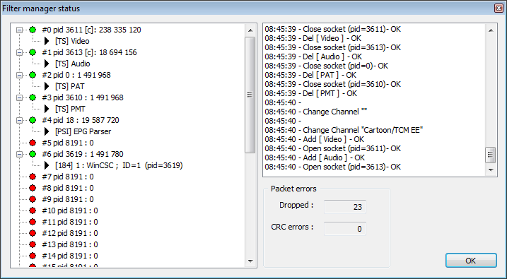 Потеряна пакетов не так уж и много, а вот аудил кодек выбранный в ProgDVB работать отказался и был взят кодек по умолчанию то есть фактически случайный. Стоит начала с настроек ProgDVB.