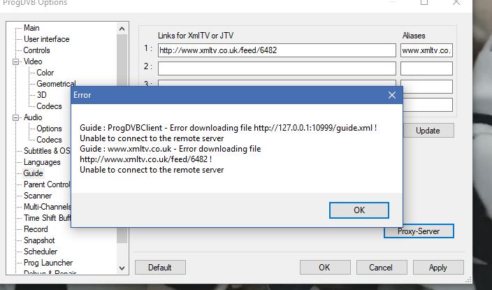 Unable to load in tv guide #1 by RLG59RD Hi, Since new update i am unable to load any tv guide into Progdvb - it used to work flawlessly. It says it cannot connect to remote server - 127.0.0.1?? Any help would be appreciated? RLG Attachments QuoteThu Aug 17, 2017 3:53 pm