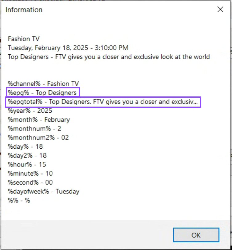 I'm trying to set up recordings so that the name of the show is in the file name, but it does not work. Using either %epg% or %epgtotal% both result in blanks in the file name when saving.