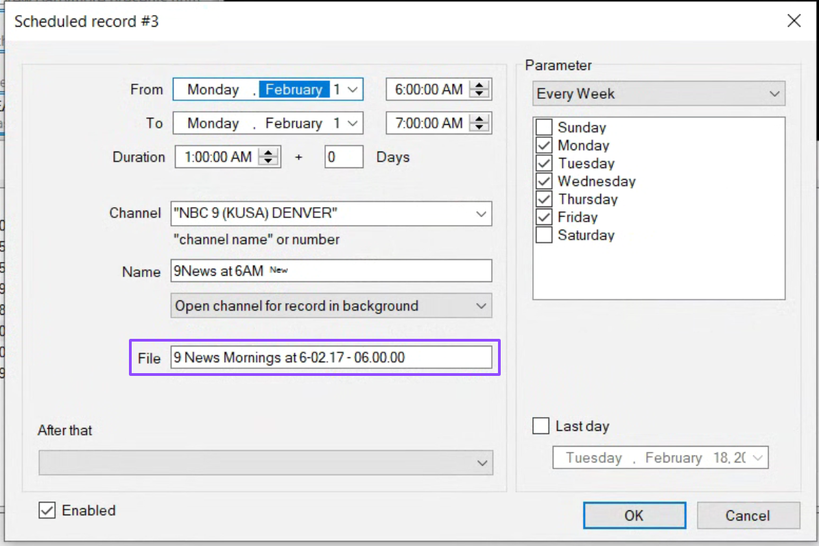 I've also tried experimenting with naming the file in the scheduler settings, but have only been able to use a static name... which seems to cause every day's program to record with the same name.