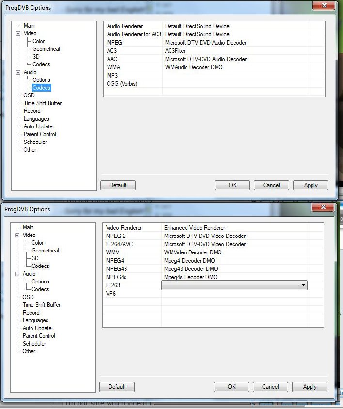 It's easy, go to Options, Video -> Codecs, and here you will find that codec you're using.ronart wrote:I'm not sure which video codecs I use. What i do know its progdvb pro 21 day trial.Cjcr wrote:What video codecs are using?
