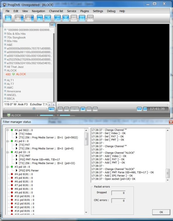 #1Just installed ProgDVB 6.42.1 x64 trial to a Win 7 PC with Twinhan 1020a DVB-S card and latest Twinhan BDA drivers V 1.2.3.8. Selected generic BDA Source in Prog (with Twinhan source behavior is the same). The program can normally scan channels of a selected sat, with high L and Q. But when I click on any of the scanned channel, the channel switcher shows up in picture window, but there is no sound and picture. Changing and installing more codecs doesn't help. The same card works OK in Win XP SP3 with WDM drivers and another viewer. It also worked with previous Prog version and the same BDA drivers in Win 7. I tried to run it with /debug option (C:\Program Files\ProgDVB\ProgDvbNet.exe /debug), but when I close it there is no Prog....log file on the HD. What can be the cause of "No video / audio" and how to fix?