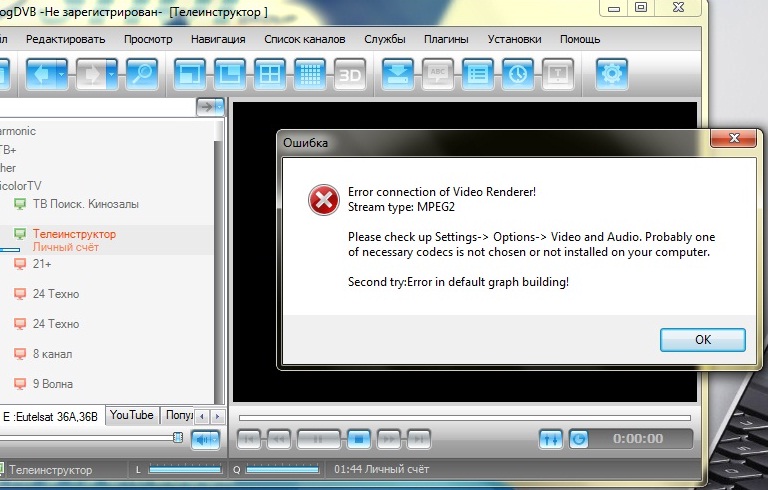 #1Подскажите как выйти из ситуации, при попытке просмотра телеканалов в MPEG2 возникает ошибка, картинки нету, только звук, каналы H264 и HD показывают нормально, в чём может быть причина, система WIN7 HOME BASIC X64, кодеки и демультиплексер переключал, скрин с ошибкой прилагаю